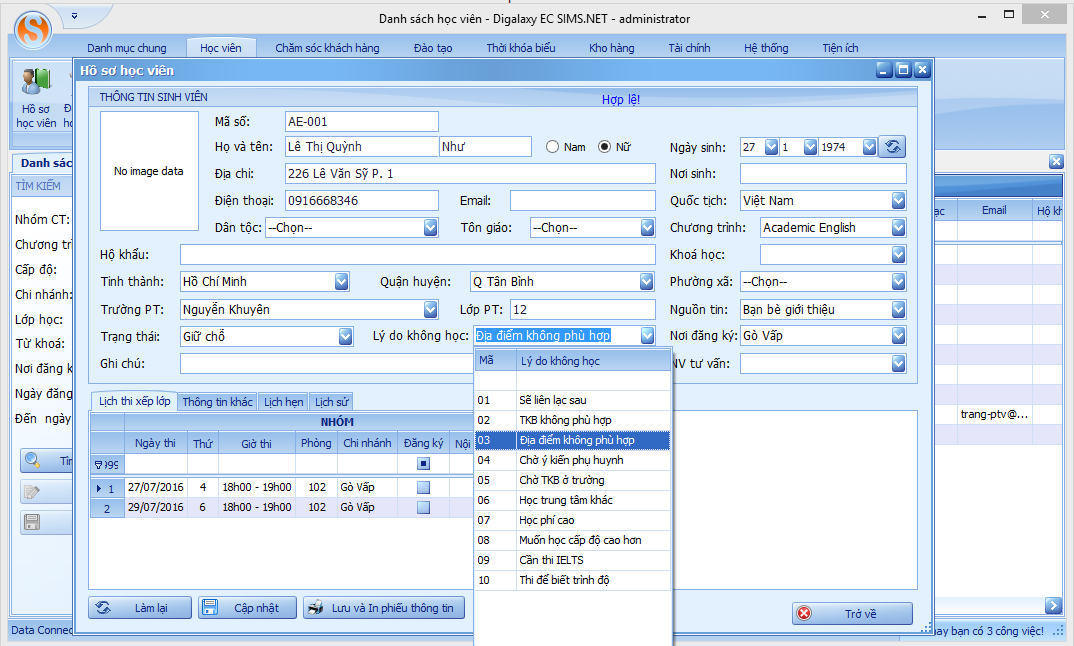 Sắp lịch thi xếp lớp cho chương trình Anh Văn, đăng ký lịch thi xếp lớp, theo dõi lịch sử tư vấn học viên, kết quả tư vấn, lịch công việc, lịch hẹn, nhắc việc,... là một số tính năng nổi bật, mới được bổ sung trong hệ thống phần mềm quản lý trung tâm Anh Ngữ Digalaxy EC SIMS.NET