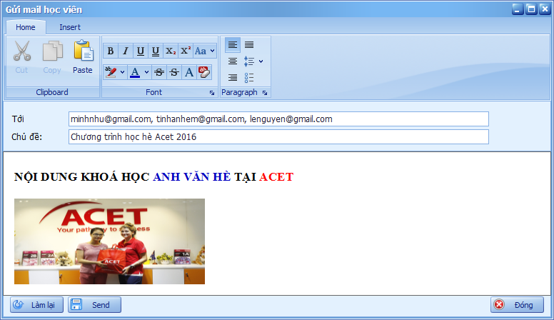 Mỗi mùa chiến dịch tuyển sinh, mỗi đợt mỗi kỳ, chúng ta dùng nhiều kênh để quảng bá, trong đó có phương thức email marketing, giờ đây tính năng gởi mail này đã được tích hợp trong phần mềm quản lý trung tâm Anh Ngữ toàn diện. Có thể gởi hàng loạt cho nhiều học viên, nội dung có kèm link và hình ảnh, thậm chí là âm thanh.