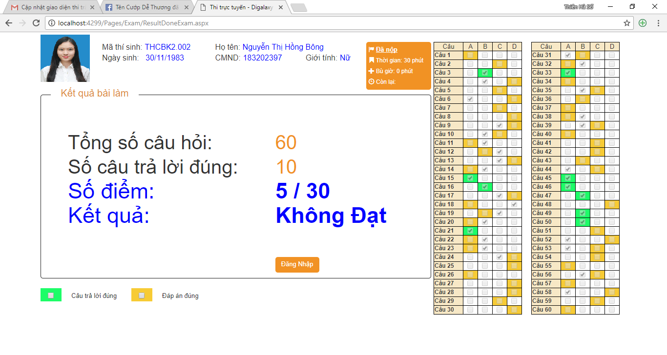 Giám thị/ cán bộ coi thi có thể in trực tiếp bài làm của thí sinh từ phần mềm quản trị phòng thi trắc nghiệm trực tuyến này. Đây chính là giấy làm bài của thí sinh, có phần làm bài, phần đáp án, và kết quả bài thi. Thí sinh sẽ ký xác nhận nộp bài vào tờ giấy này.