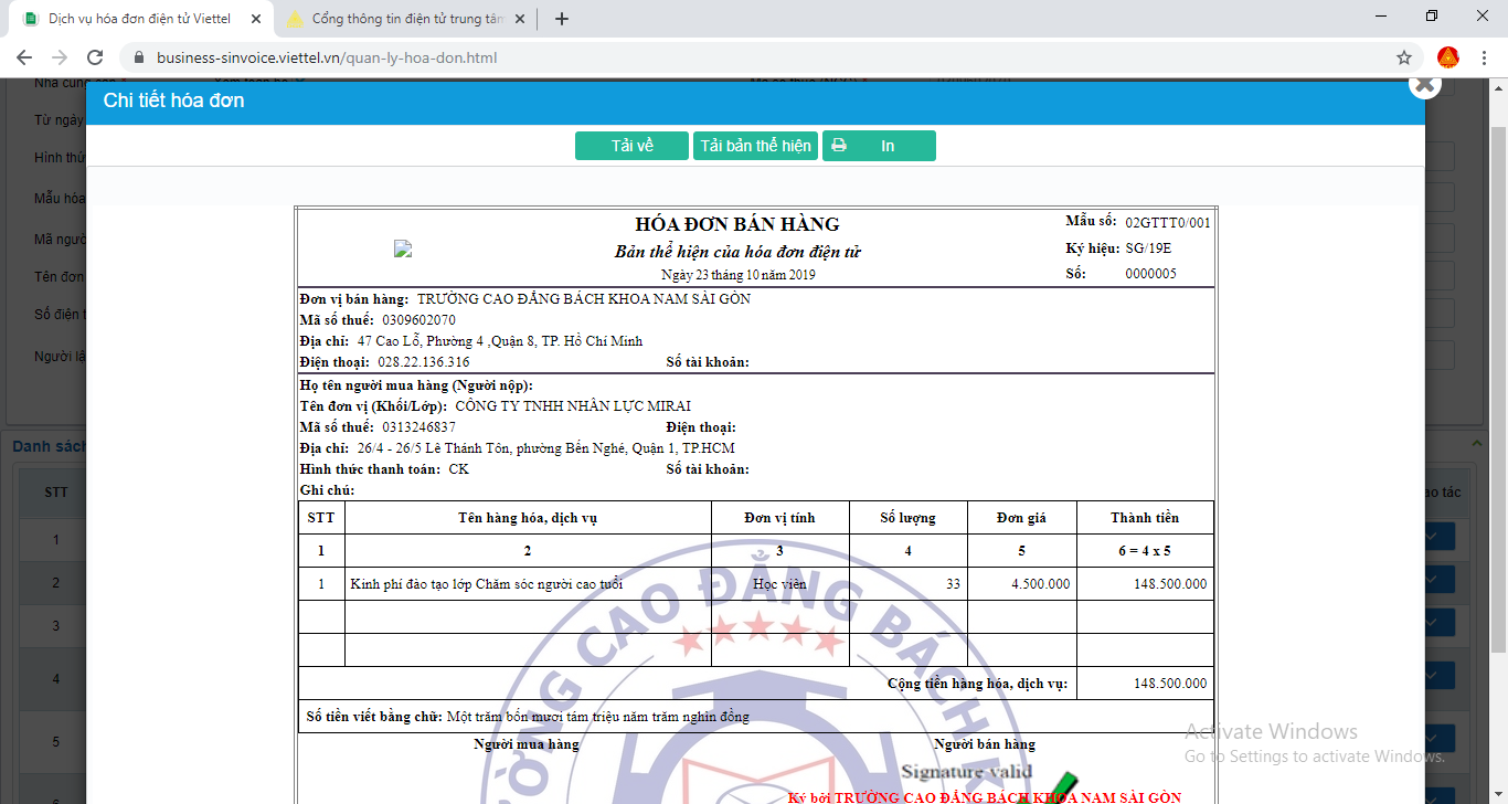 Một số màn hình demo chương trình lập hóa đơn điện tử đã được triển khai thực tế cho Trường Cao đẳng Bách Khoa Nam Sài Gòn.